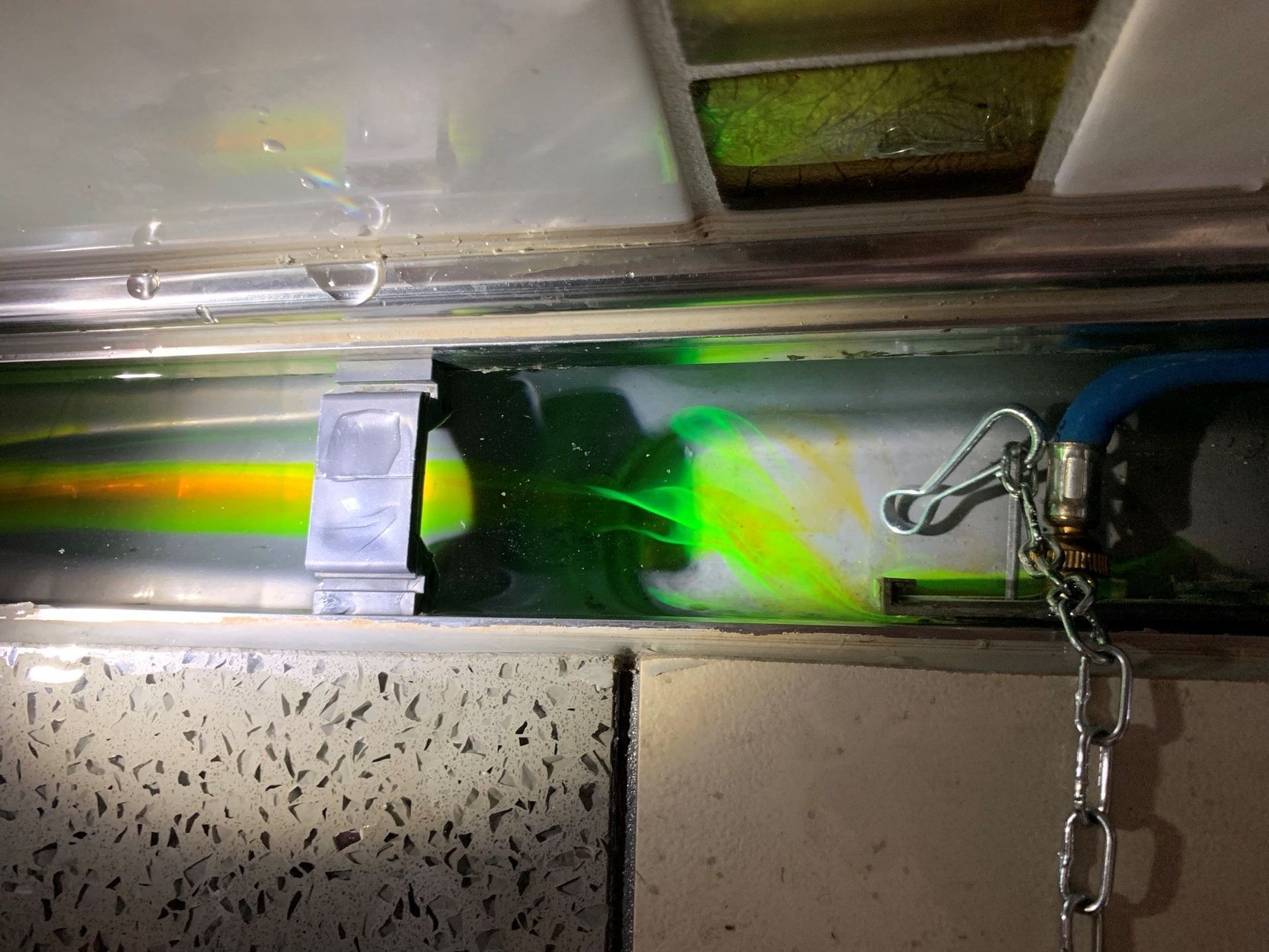 Durch die Beigabe einer wässrigen UV-Pigmentdispersion können auch ganze Flachdachbereiche manuell geflutet und die Dichtigkeit geprüft werden. Aufgrund der geringen Pigmentgrösse kann das Färbemittel auch Kapillare durchwandern. Unter normalem Licht ist dieser Farbstoff farblos, weshalb Verfärbungen an Mauern, Decken und Wänden nicht mit blossem Auge sichtbar sind. Um die Austrittsstellen auszumachen, wird eine Hochleistungs-UV-Lampe benötigt.